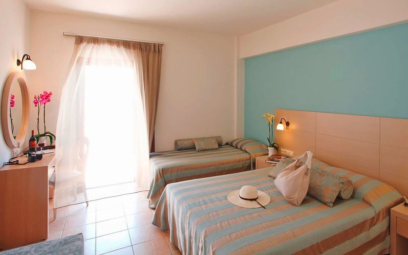 Die Doppelzimmer sind 20 m² groß, es gibt auch Einzelzimmer. Zur Ausstattung gehören ein Bad mit Dusche, WC und Föhn, ein Minikühlschrank, ein Balkon, Sat-TV und Telefon, ein gebührenpflichtiger Safe, eine individuell regulierbare Klimaanlage und zubuchbar der seitliche Meerblick. Die Doppelzimmer können mit zwei Erwachsenen und einem Kind belegt werden. In den Zimmern gibt es Babybetten, sie können sich auch einen Hochstuhl geben lassen. Das Hotel bietet Ü/F oder Halbpension mit Frühstücks- und Abendbuffet an.